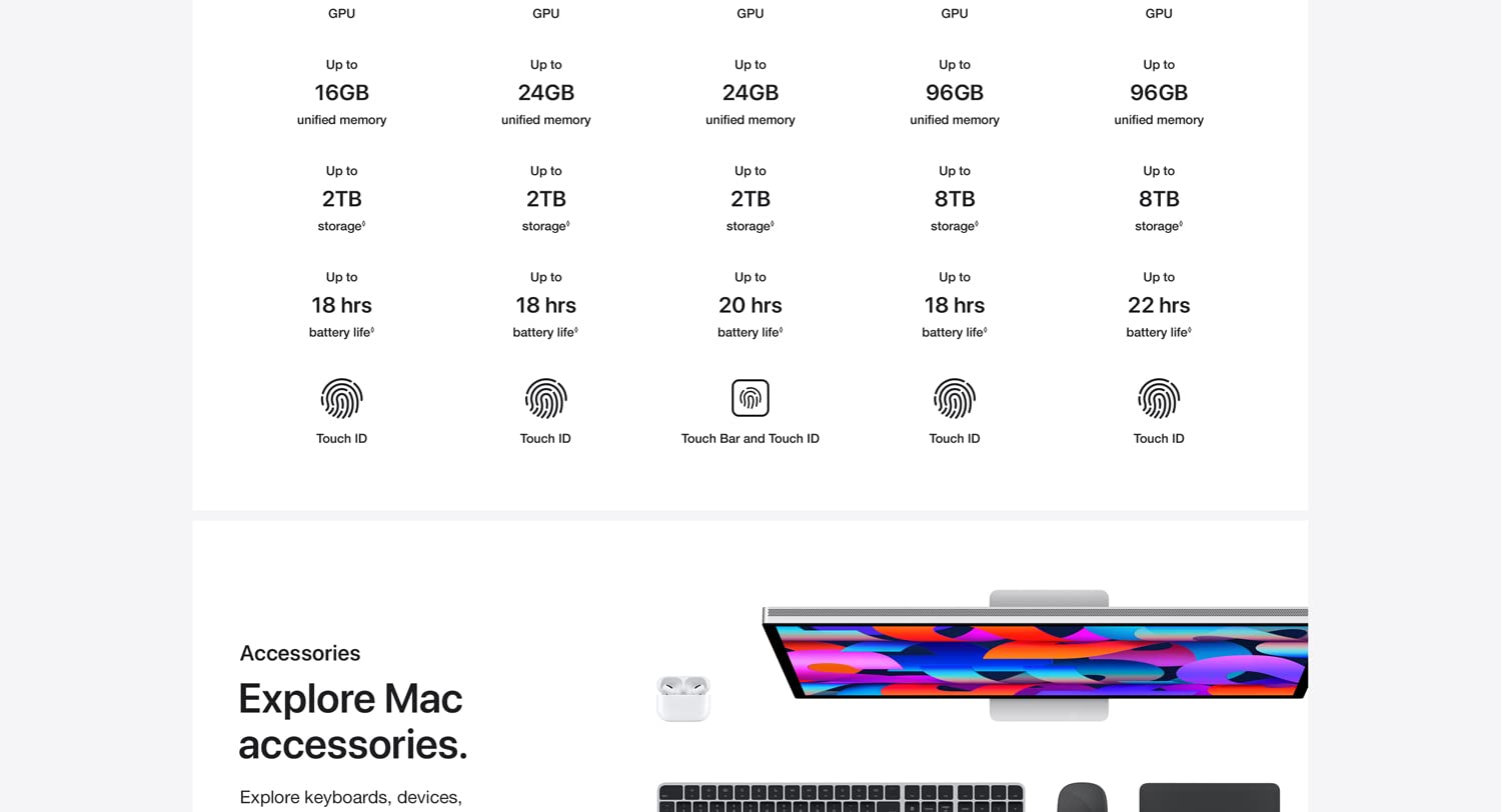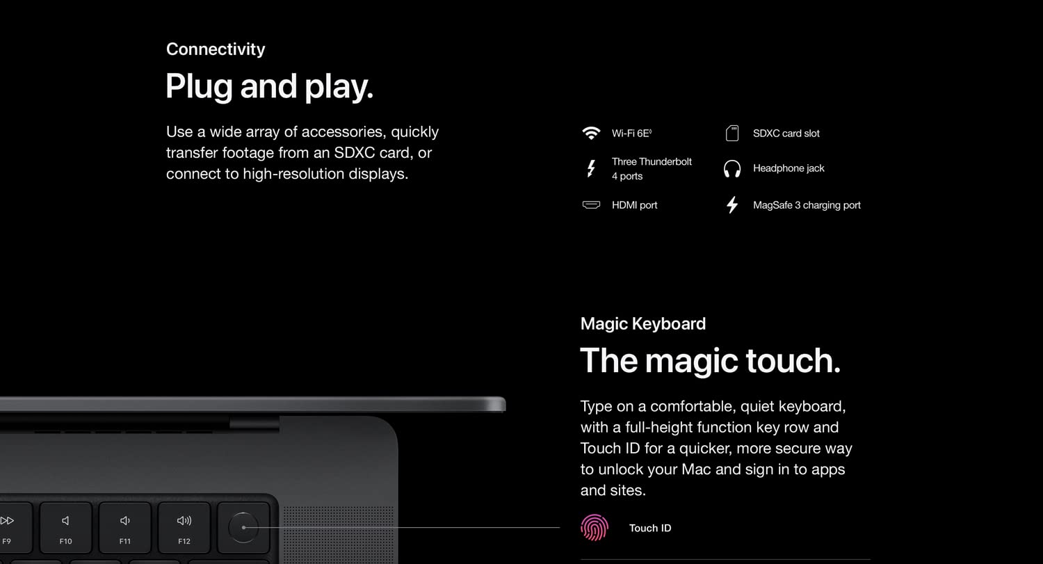 | Ports | : | 3× Thunderbolt 4 HDMI SDXC MagSafe 3 |
